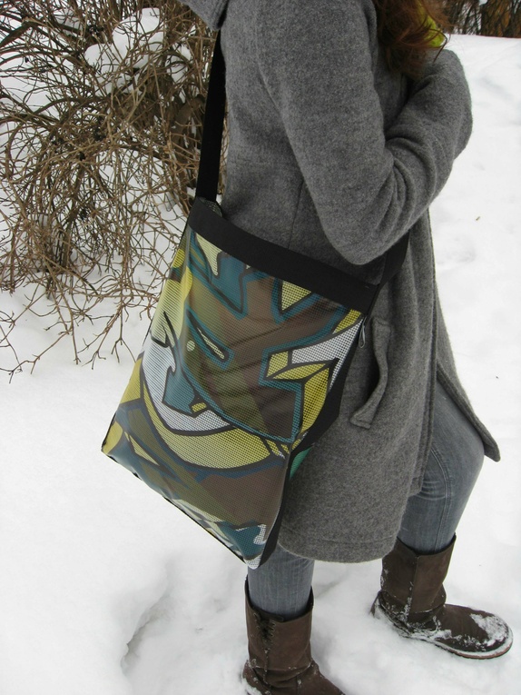 Plastikkmaterialet vesken er sydd av har et oppblåst graffitiprint i ulike grønne nyanser med konturer i sort.