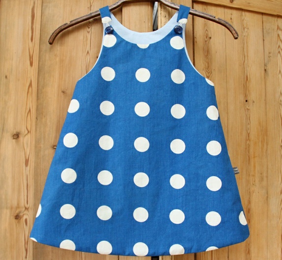 Fór i lyseblått bomullsstoff, og mørkeblå knapper som festes med strikkhempe over skulderen.