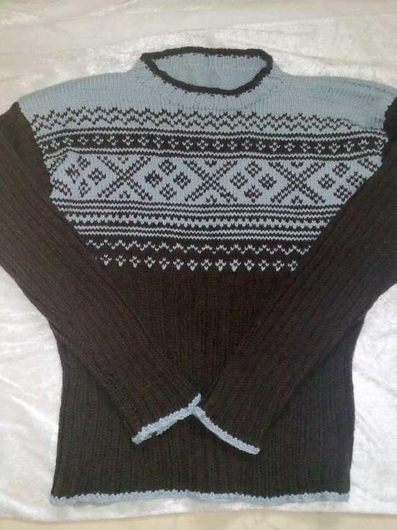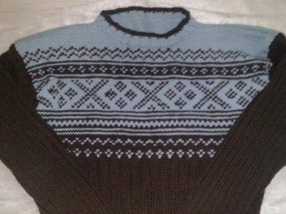 Genseren på bildet er strikket i fargene mørke brun og lyse blå.