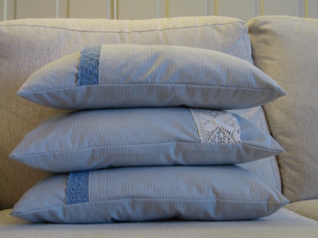 Nydelig avlang minipute i blåstripet bomull. I skjøten har jeg sydd på søt blå blondekant.