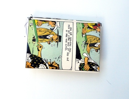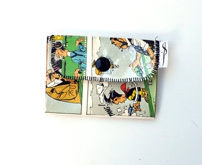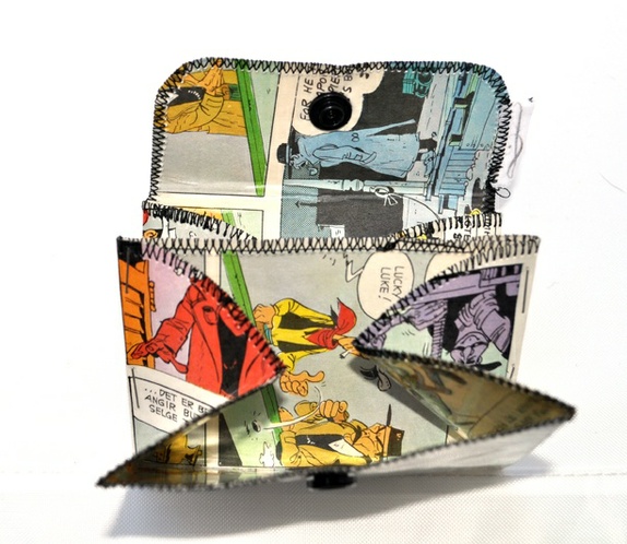 Denne lommeboken er laget av en gammel tegneserie side som har blitt laminert for å gjøre den holdbar. Den har to rom og plass til både bankkort, mynter og sedler.