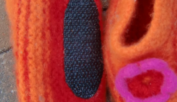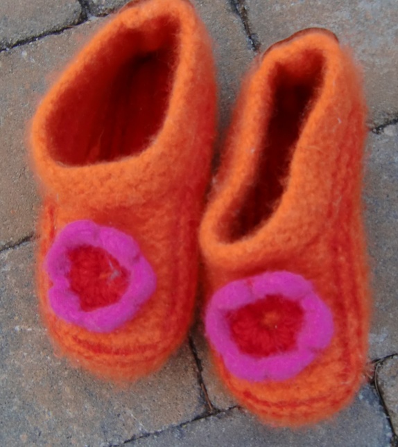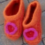 Tova tøfler i oransje med rød striper og rosa blomst.Tøflene har "såle" slik at de ikke er glatte.Utrolig gode og varme.