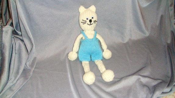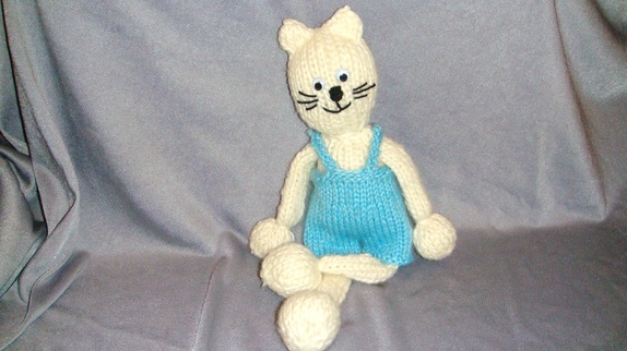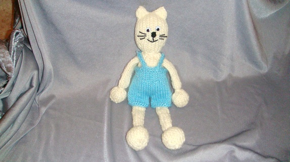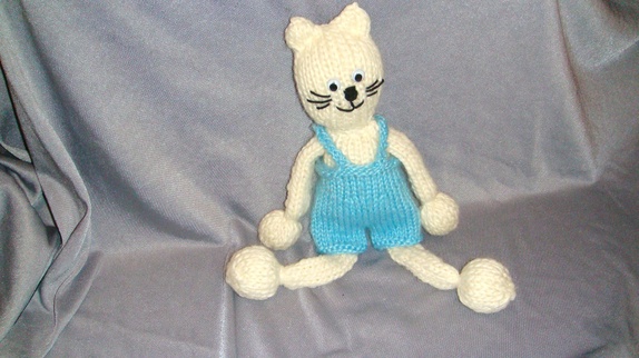 Katten er strikket i 50% ull og 50% akryl. Han er 33 cm lang . Har dingleben og armer ( bare hender, føtter og kroppen er fylt med vatt) De bevegelige øynene er sydd fast.