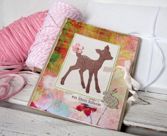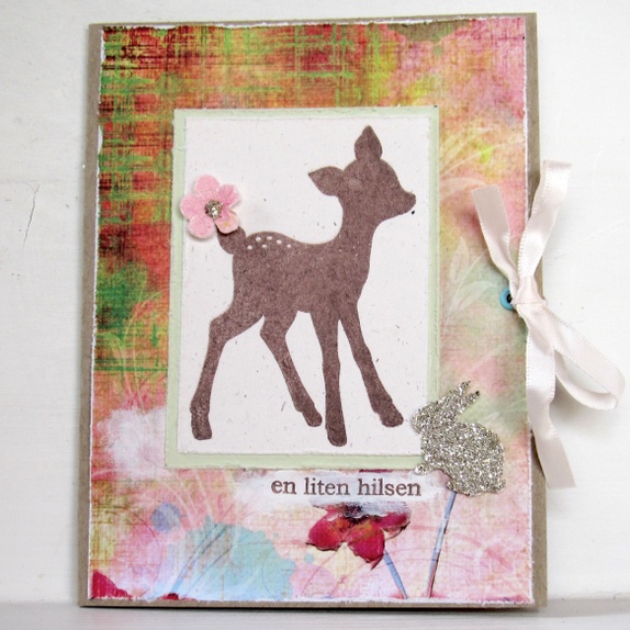 Det er pyntet med lekkert, fargerikt designpapir med slitte kanter og et håndstemplet motiv av Bambi i mørk brunt. Kaninen "Trampe" er belagt med sølv glassglitter. I kortets åpning er det hull med turkise maljer og en blekrosa sløyfe. "En liten hilsen" er håndstemplet i mørk brunt.