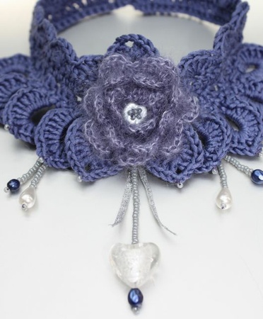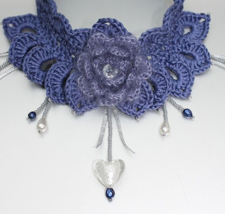 Smykket består blålilla garn i bomull, mohair og silke.Påsydd perler og bånd.Måler 34 cm.