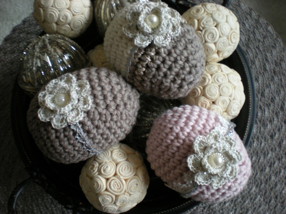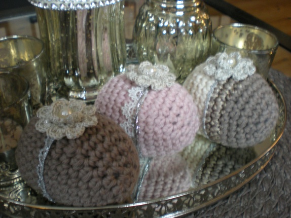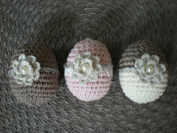 Søte heklede egg i blanding av bomull/ull og litt merisert garn. Pyntet med blonder i sølv/offwhite og små blomster i offwhite iheklet sølvtråd. Perle m/sølvkant i midten (brad).