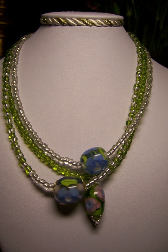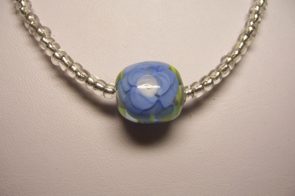 Søtt halssmykke i sarte farger.......PerliDo lampworkperle (m blå blomst) sammen med ishvite seedbeads tredd på smykkewire.Sølvforgylt lås.Lengde 38cm +5cm forlengelseslenkeFlere smykker i samme serieKjøp et, kjøp to.....tre....
