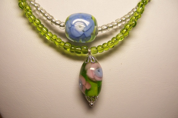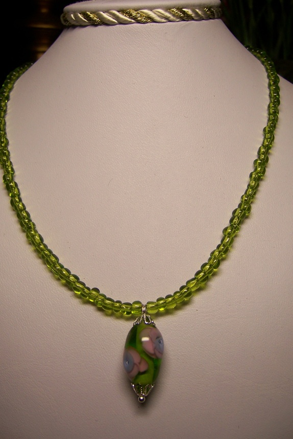 Vårgrønt halssmykke med hengende PerliDo lampwork-perle (25x12mm) m rosa blomst.Vårgrønne seedbeads, sølvforgylte perlehatter og lås.Lengde 40cm + 5cm forlengelseskjede.