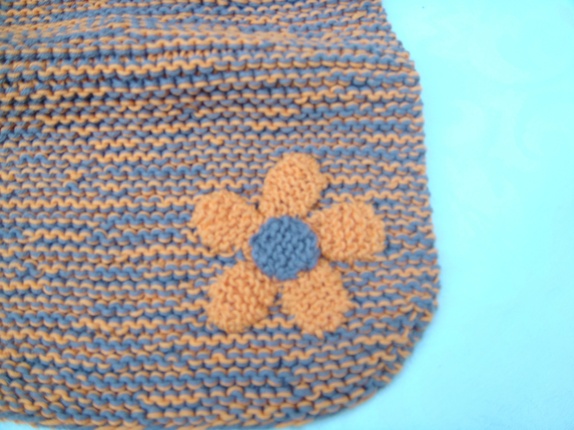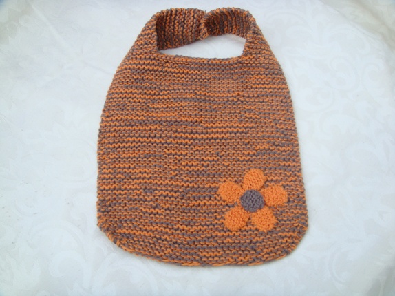 Strikket i dobbel Mandarin naturell ( 100% bomull)Smekken er pyntet med en strikket blomst og lukkes med knapp bak.Den er 20 cm bred og 23 cm lang uten stropper.Vaskes på 60 grader i maskin. OPS hoved bilde viser riktig farge.