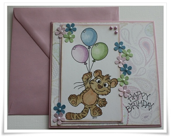 Kortet str er ca 13x13. Kommer i farget konvolutt som på bilde. Motivet er farget med hånd av meg. Et kort i glade farger