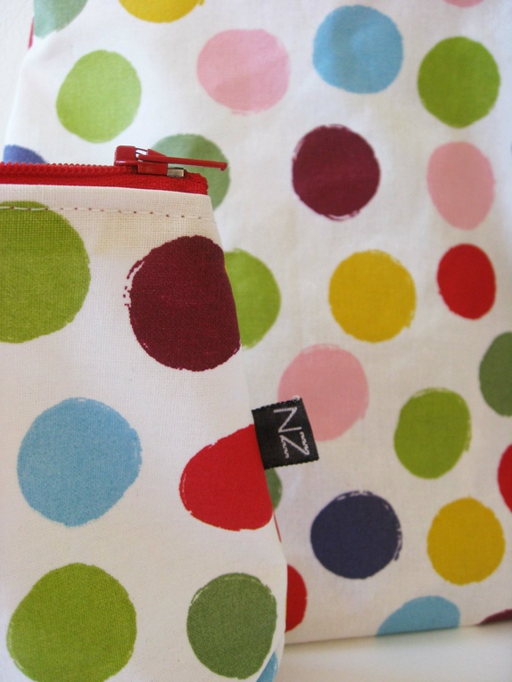 Mellomstor pung med 15 cm glidelåsåpning. Pungen er sydd i et hvitt plastbelagt bomullsmateriale med store prikker i spreke farger og en rød glidelås.