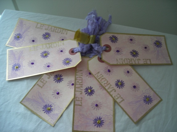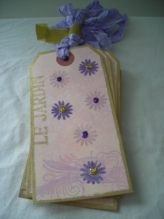 Jeg har farget bakgrunnen med "distress ink" i svake fiolettoner, stemplet blomstene med lys lilla og mørk lilla blekk og pyntet blomstene med glitter i mørk lilla og gull. "Le Jardin" (hagen) er stemplet i gull.
