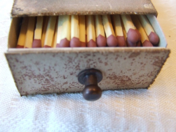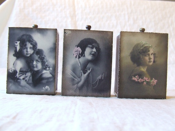 Fyrstikkeskene er pyntet med vintage bilde,samme motiv på begge sider.
