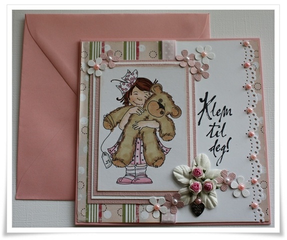 Kortet str er ca 13x13. Kommer i farget konvolutt som på bilde. Motivet er farget med hånd av meg.