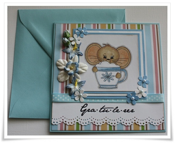 Kortet str er ca 13x13. Kommer i farget konvolutt som på bilde. Motivet er farget med hånd av meg. Et kort i glade farger