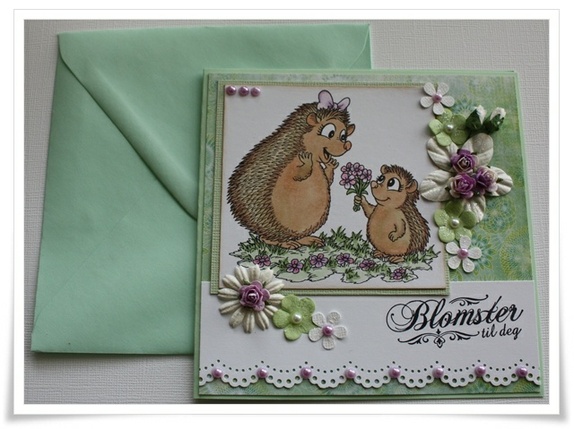 Kortet er i 13x13 str og levers med farget konvulutt som på bilder. Dette kortet er kun dekorert på forsidenstemplet er malt med hånd. Stemplet er fra karensdoodles.