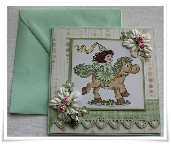 Kortet er i 13x13 str og levers med farget konvulutt som på bilder. Dette kortet er kun dekorert på forsidenstemplet er malt med hånd. Stemplet er fra karensdoodles.