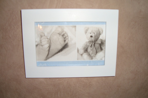 Serviett-bilde i hvit fotoramme m/glass.Oppheng for vegg og støtte for å stå på bord.14 * 18,5 cm