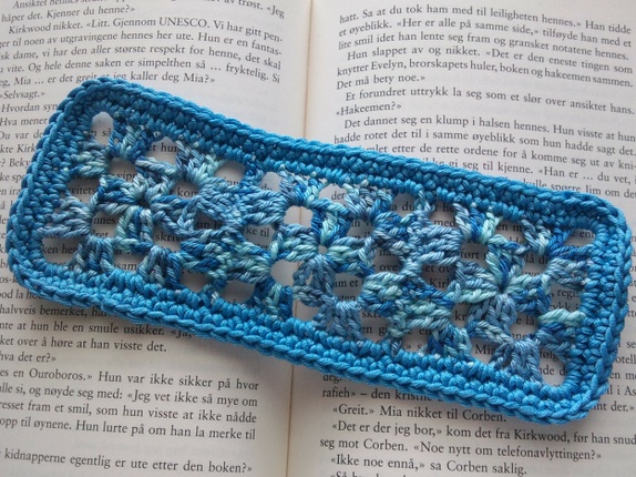 Bokmerke, som er heklet med oldemorsruter.