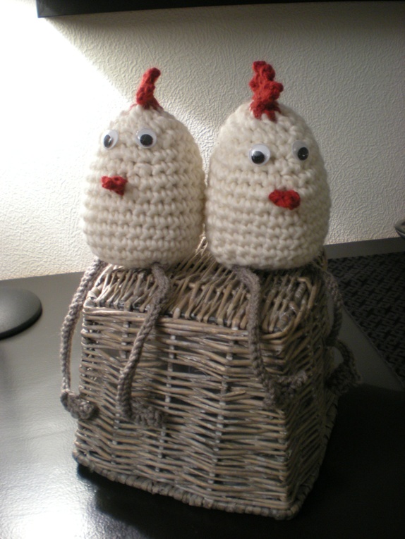 To søte heklede høner som ønsker seg et nytt hjem før påske. Heklet i ullgarn. Øyne er pålimet.