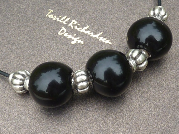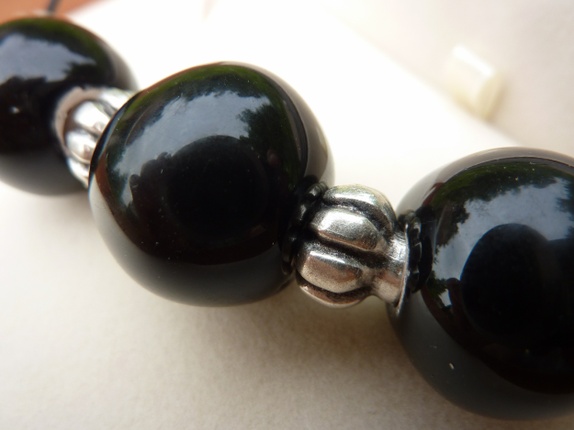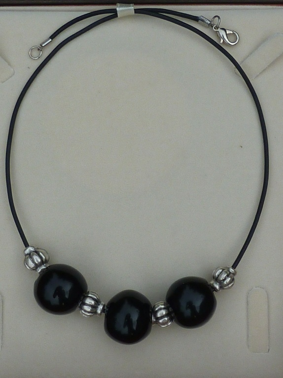 Halssmykke av sorte kuler i keramikk og mellomdeler i metall. Kulene har en diam. på 1.5 cm.Sort lærsnor med karabinlås.Smykket er 45,5 cm langt.FØR KR 349,- NÅ KR 295,-