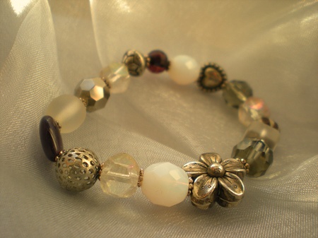 Nydelig armbånd med sorte, sølvfargede og hvite perler.(I strikk slik at du kan justere størrelsen).