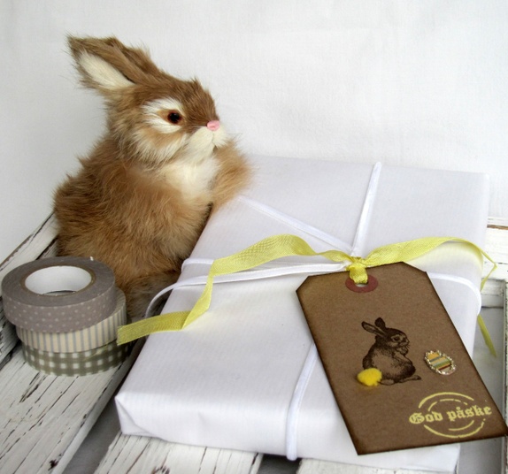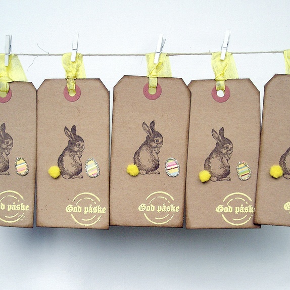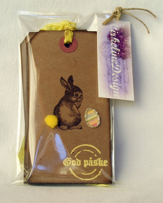 Gavelappene er dekorert med en håndstemplet harepus i mørk brunt med gul pomponghale og et fargerikt påskeegg med sølv glassglitter i kantene. "god påske" er embosset (stemplet med forhøyet skrift) i gult. På baksiden er det stemplet "Til" og "Fra", og de er plass til å skrive en personlig hilsen. Gule sløyfebånd hører med.