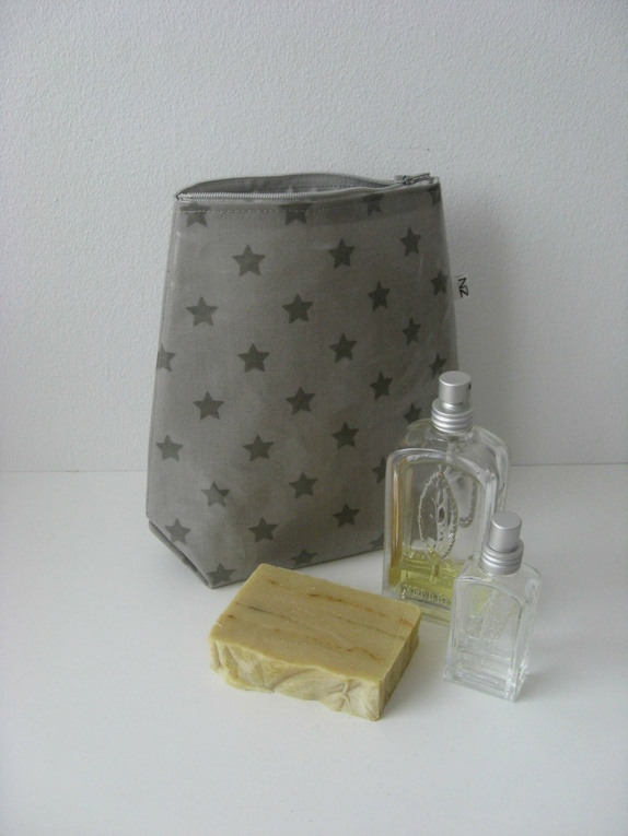 i et grått vannavstøtende materiale med stjerner i mørkere grått.