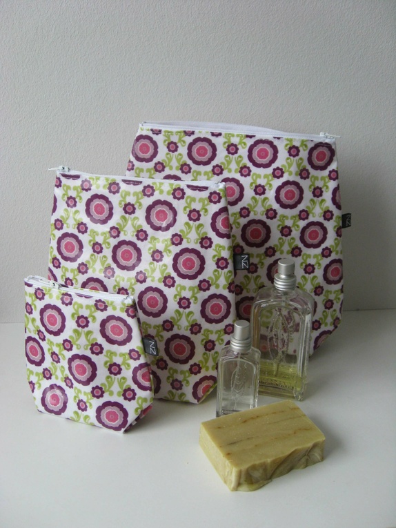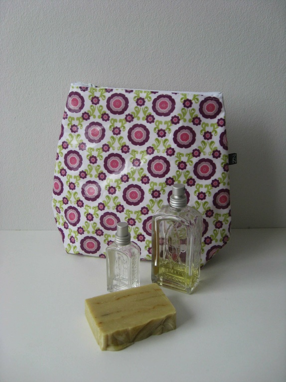 Toalettmappen har en glidelåsåpning på 20 cm og er sydd i et hvitt vannavstøtende materiale med blomster i lilla og rosa med friske grønne blader.
