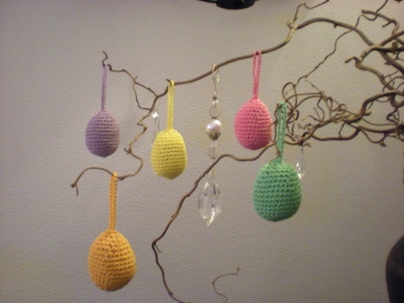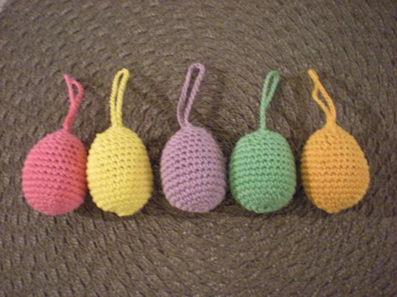 Eggene er heklet i bomullsgarn og fyllt med fyllvatt.