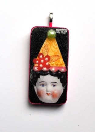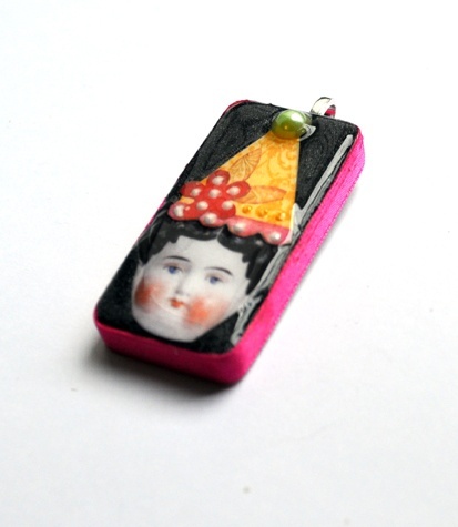 Dette anhenget består av en dominobrikke (2,5 x 5 cm)som er dekorert med forskjellige ting som feks papir utklipp, servietter og bånd for å skape en liten unik og dekorativ collage. Overflaten er beskyttet med dimensional lakk som gir dybde.