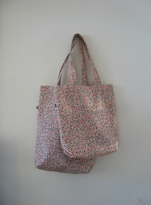 Fint og praktisk nett til handleturen, treningstøy eller andre små og store saker. Nettet er sydd i et kraftig bomullsmateriale, pvc-belagt, i offwhite/beige med et mylder av små prikker i oransje, rustrødt, sort og grått.