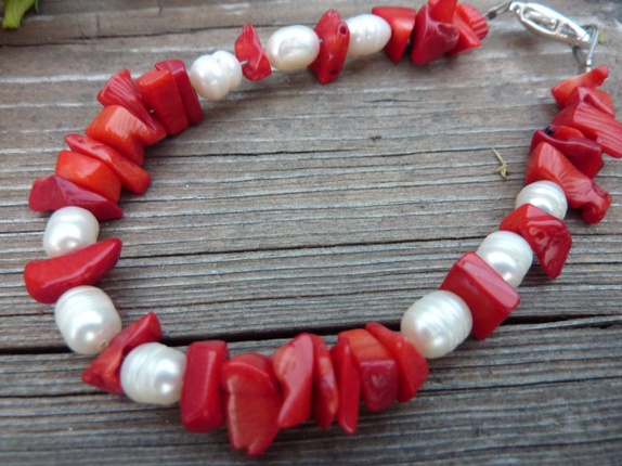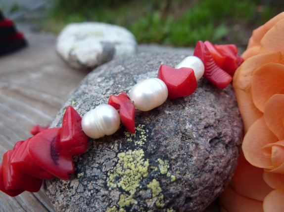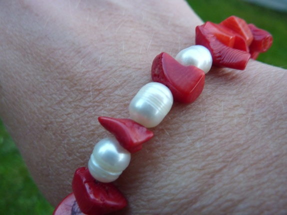 Armebåndet er lage av koraller og ferskvanns perler. Karabinlås.22 cm langt.Jeg kan justere lengden.
