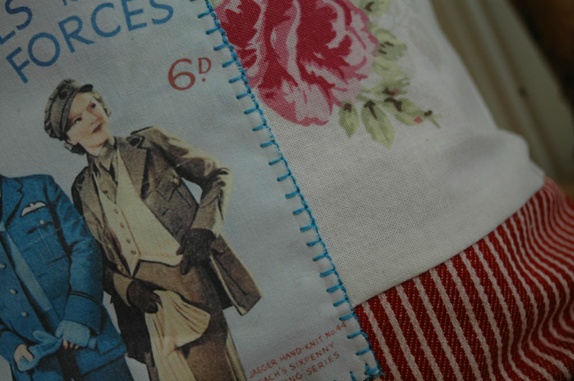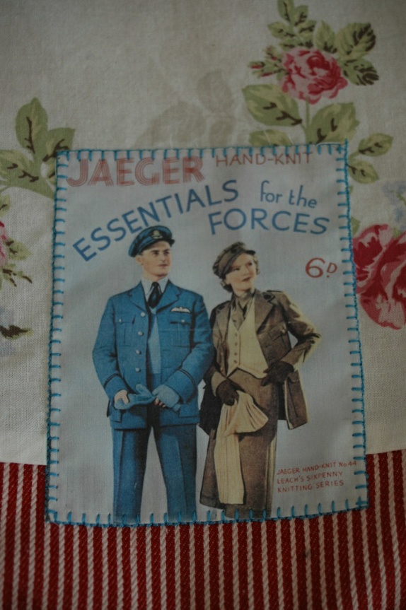 Påsydd merke med med vintagereklame for hand knits, essentials for the forces...
