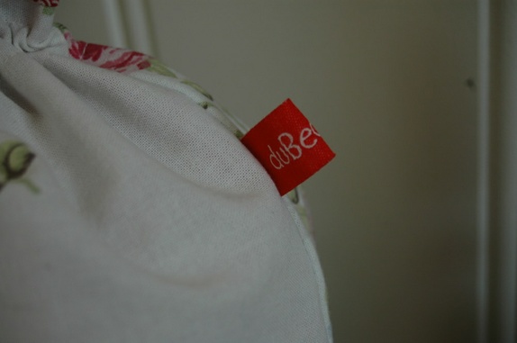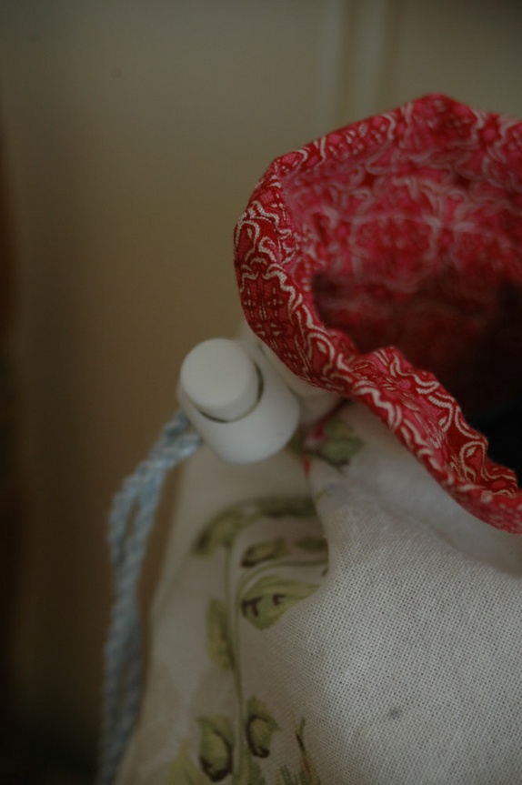 Foret med matchende tøy som synes i toppen. Alle stoffer 100% bomull. Søm tvers over i bunnen som gir volum i posen.