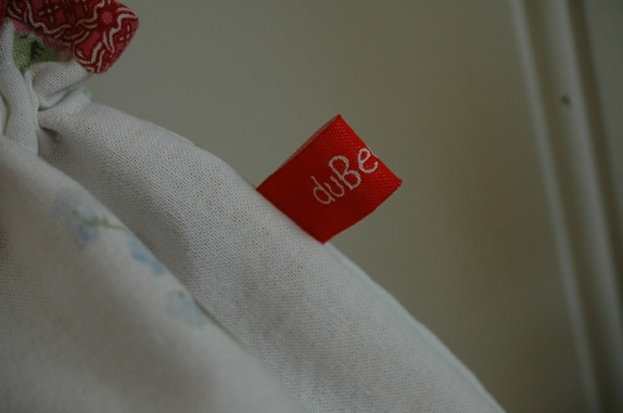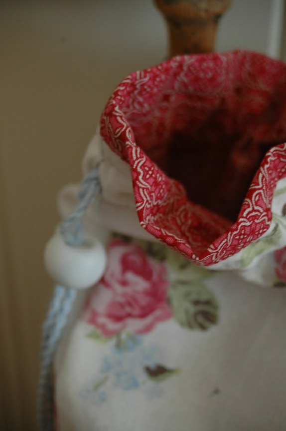 Foret med matchende tøy som synes i toppen. Alle stoffer 100% bomull. Søm tvers over i bunnen som gir volum i posen.