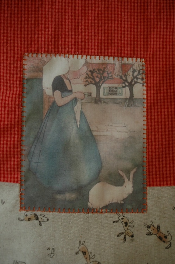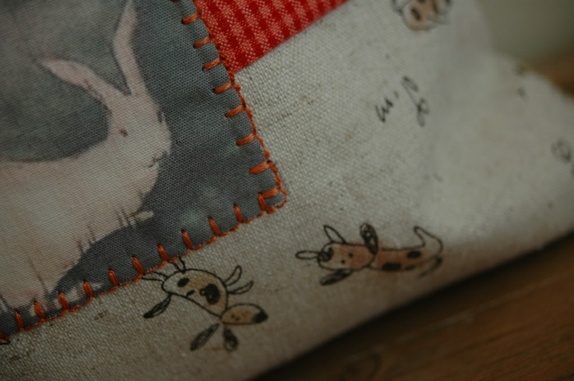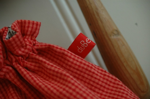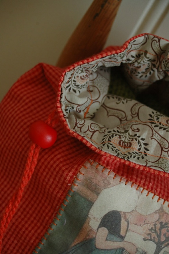 Foret med matchende tøy som synes i toppen. Alle stoffer 100% bomull. Søm tvers over i bunnen som gir volum i posen.