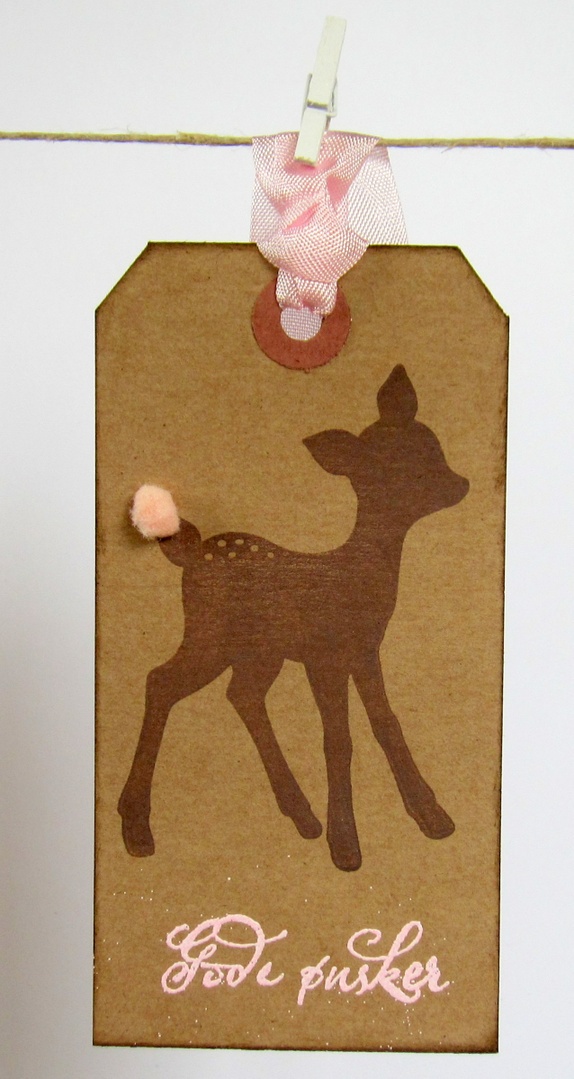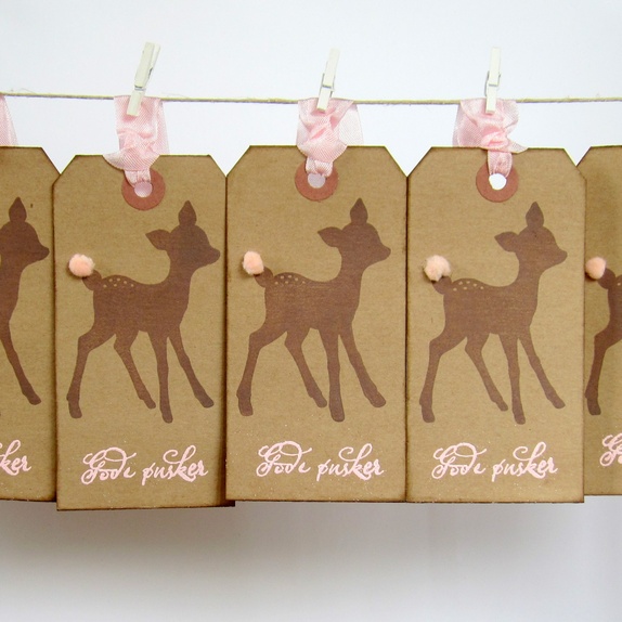 Lappene er håndstemplet med yndige Bambi i sjokoladebrunt. Hun har rosa blomst på halen. "Gode ønsker" er embosset (forhøyet) i rosa. Kantene er svertet for en "vintage look". På baksiden er det stemplet "Til" og "Fra", og det er plass til en personlig hilsen. Rosa sløyfebånd hører med.