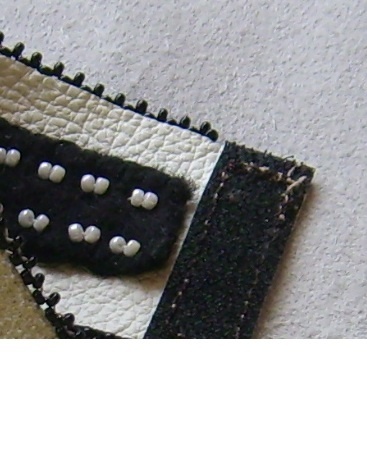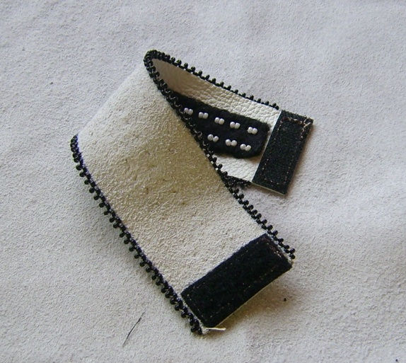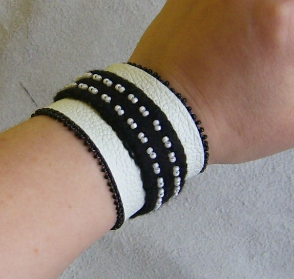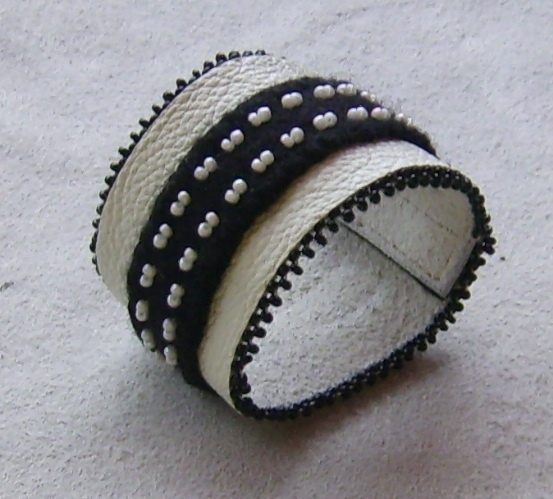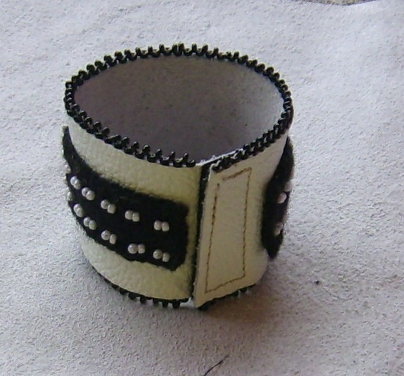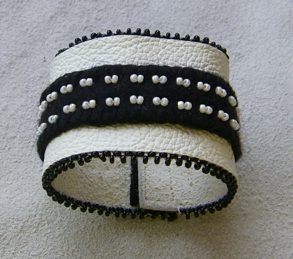 Armbånd i svart og snøhvitt laget av skinn (fra ei ku) og tovet ull (fra en sau).Ulla er kantet med tungesting for holdbarhet og festet for hånd til skinnet.