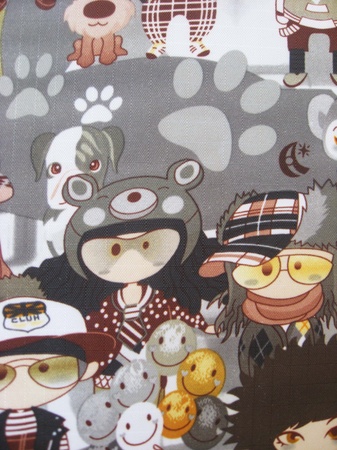 Mellomstor pung sydd i et flerfarget grått syntetisk pvc-belagt materiale med innslag av oransje. Motivet er små "tøffe kids" og en liten hund. Pungen har en glidelåsåpning på 15 cm.