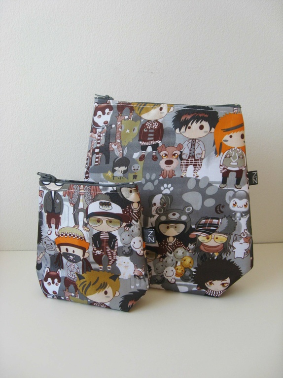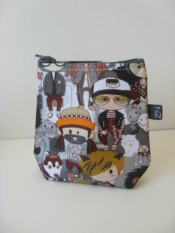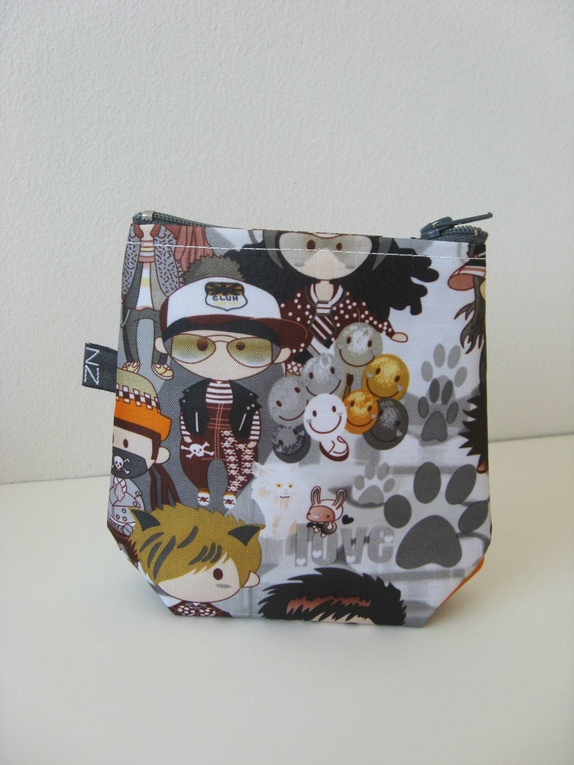 Liten pung sydd i et flerfarget grått syntetisk pvc-belagt materiale med innslag av oransje. Motivet er små "tøffe kids" og en liten hund. Pungen har en glidelåsåpning på 10 cm.