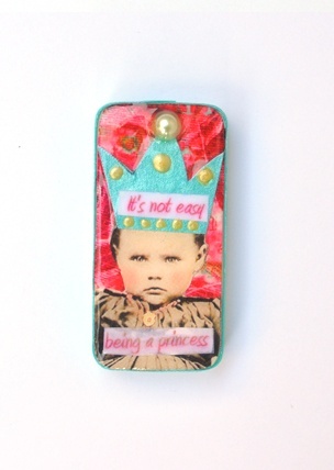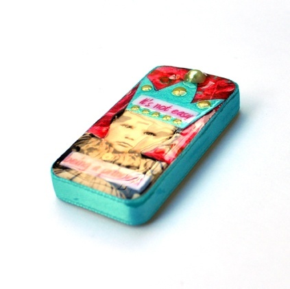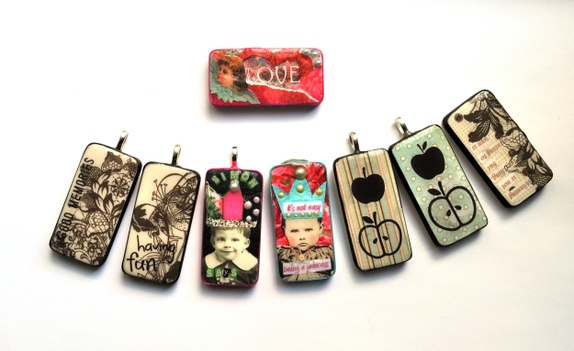 Dette anhenget består av en dominobrikke (2,5 x 5 cm)som er dekorert med forskjellige ting som feks papir utklipp, servietter og bånd for å skape en liten unik og dekorativ collage. Overflaten er beskyttet med dimensional lakk som gir dybde.