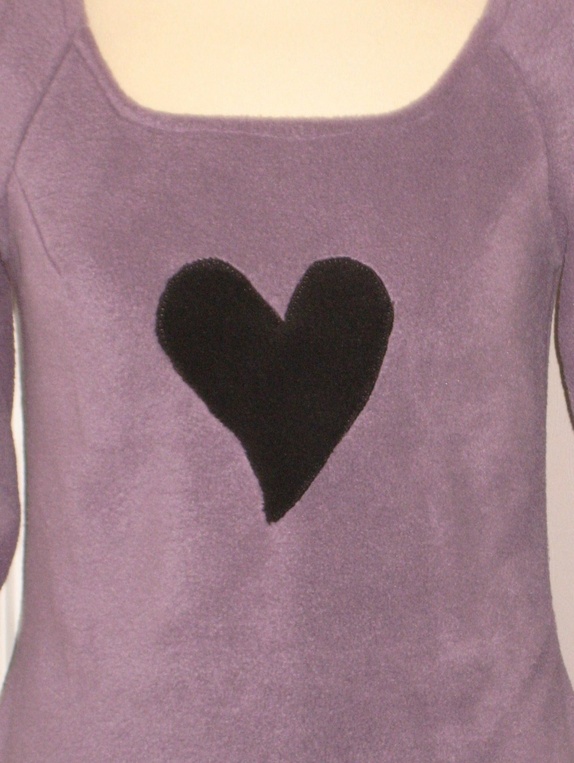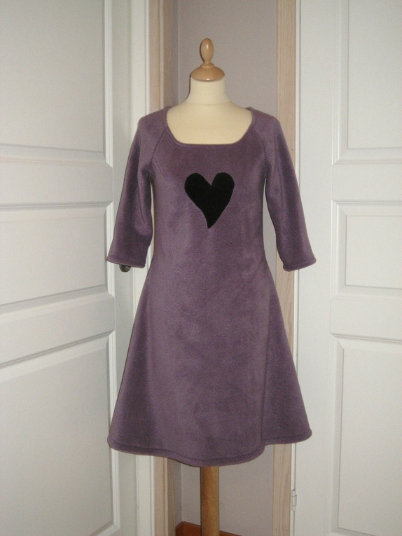 Nydelig lun kjole i lilla polarfleece med 3-kvart ermer. Kjolen er pyntet med en hjerteapplikasjon i sort fleece.