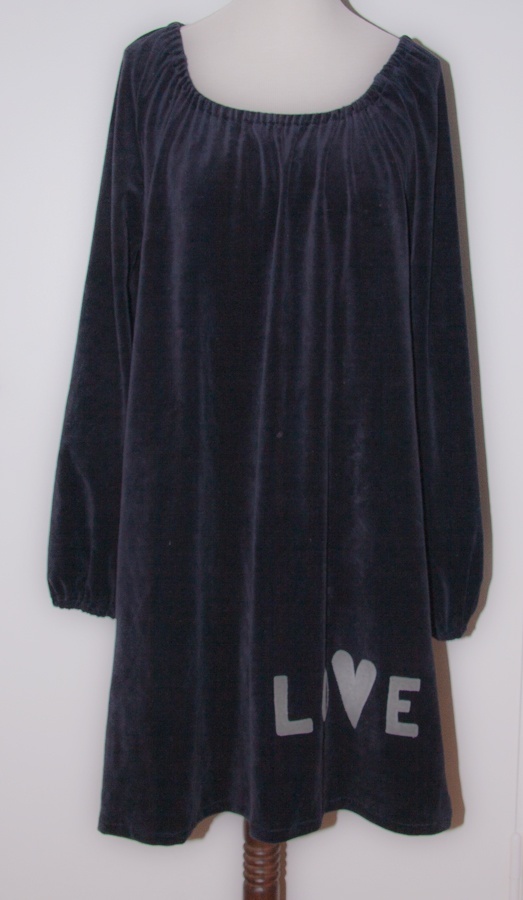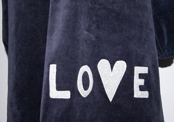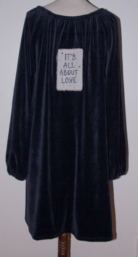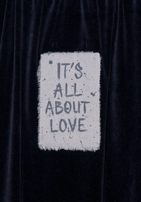 Tekst forran i grå velour.Tekst bak håndmalt grått på grått.