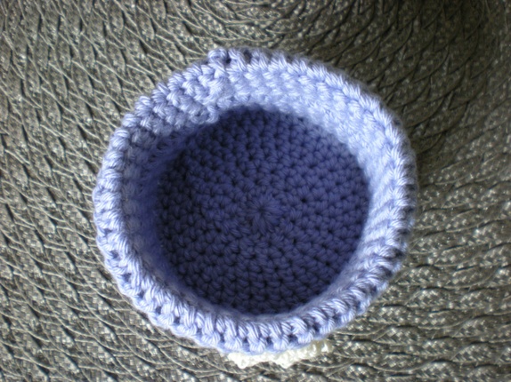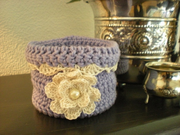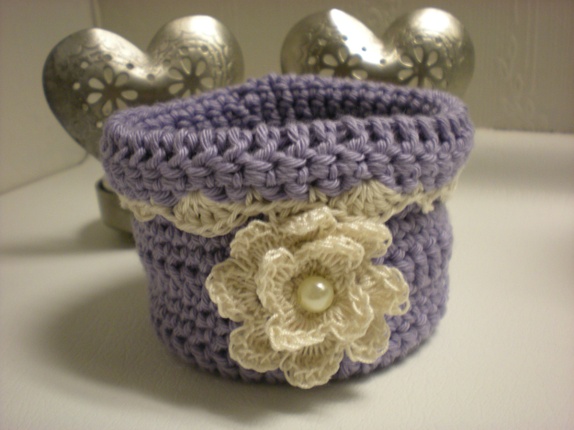 Heklet i bomullsgarn med påsydd blomst og heklet blondekant.