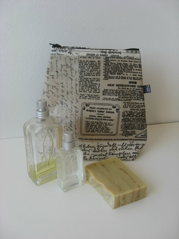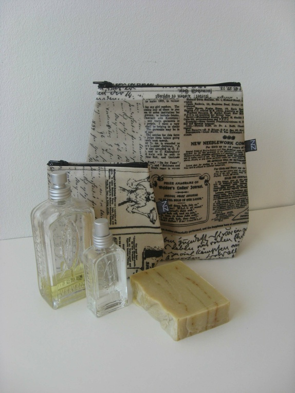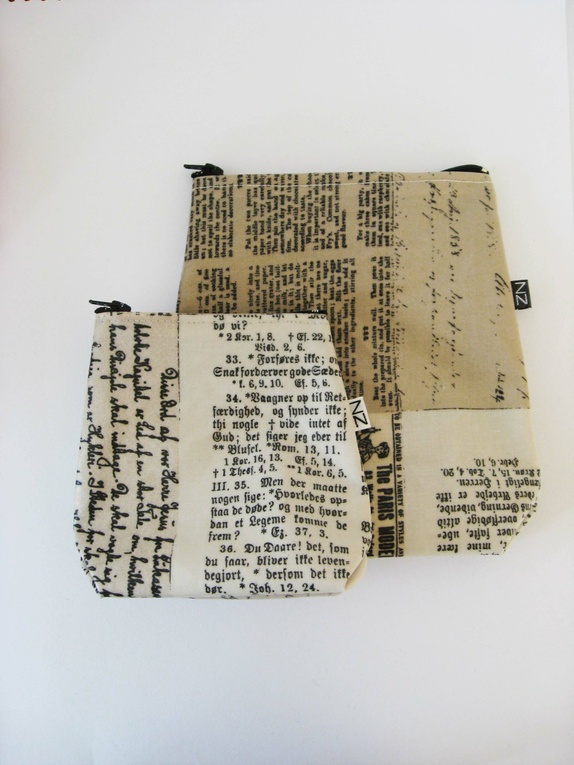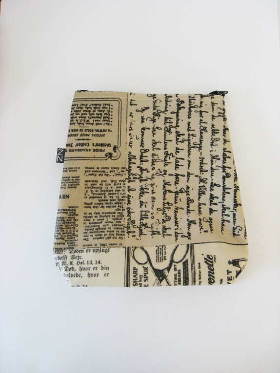 Mellomstor, beige pung med skrift og bilder i svart som har plass til litt sminke, smykker eller andre hemmeligheter.
