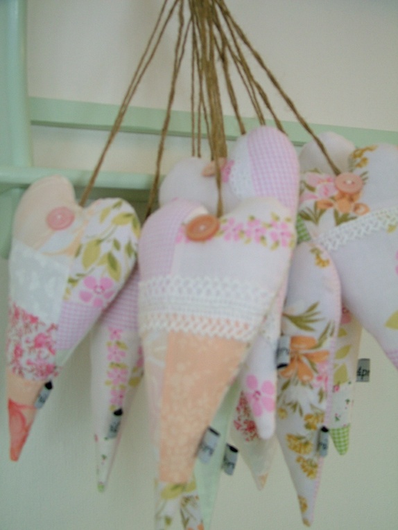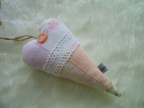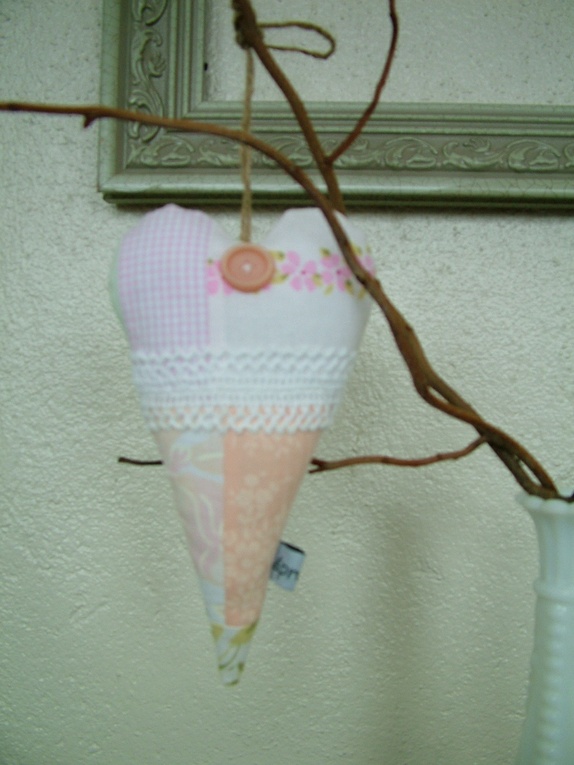 Søtt hjerte sydd i vintage stoffer i rosa og fersken. Vinatage knapp og blonde på forsiden. Baksiden er et småblomstret retrostoff i rosa og hvitt.