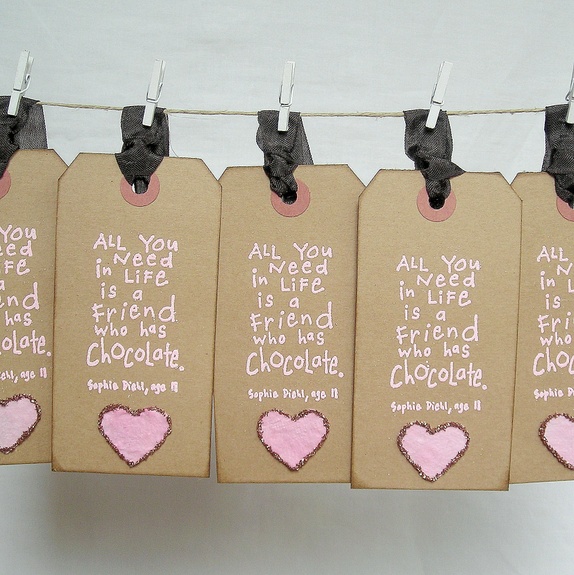 Teksten på lappene er embosset (forhøyet) i sukkertøyrosa farge og lyder som følger: "All you need in life is a friend who has chocolate". Kantene er svertet for en "vintage look". Nederst er det et rosa hjerte med brunt glassglitter rundt. På baksiden av lappene er det stemplet "To" og "From", og det er plass til en personlig hilsen. Gavelappene har sjokoladebrune sløyfebånd.