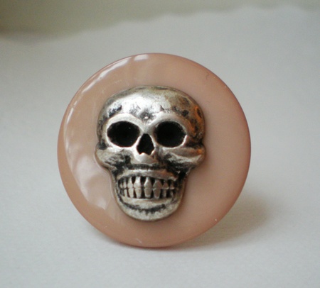 Gammelrosa sirkelformet ring med et sølvfarget dødninghode i metall.
