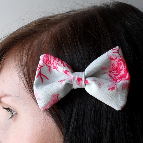 Sløyfe til håret som er håndsydd av et lyst, gråblå aktig stoff med et rosa mønster av roser og fugler.